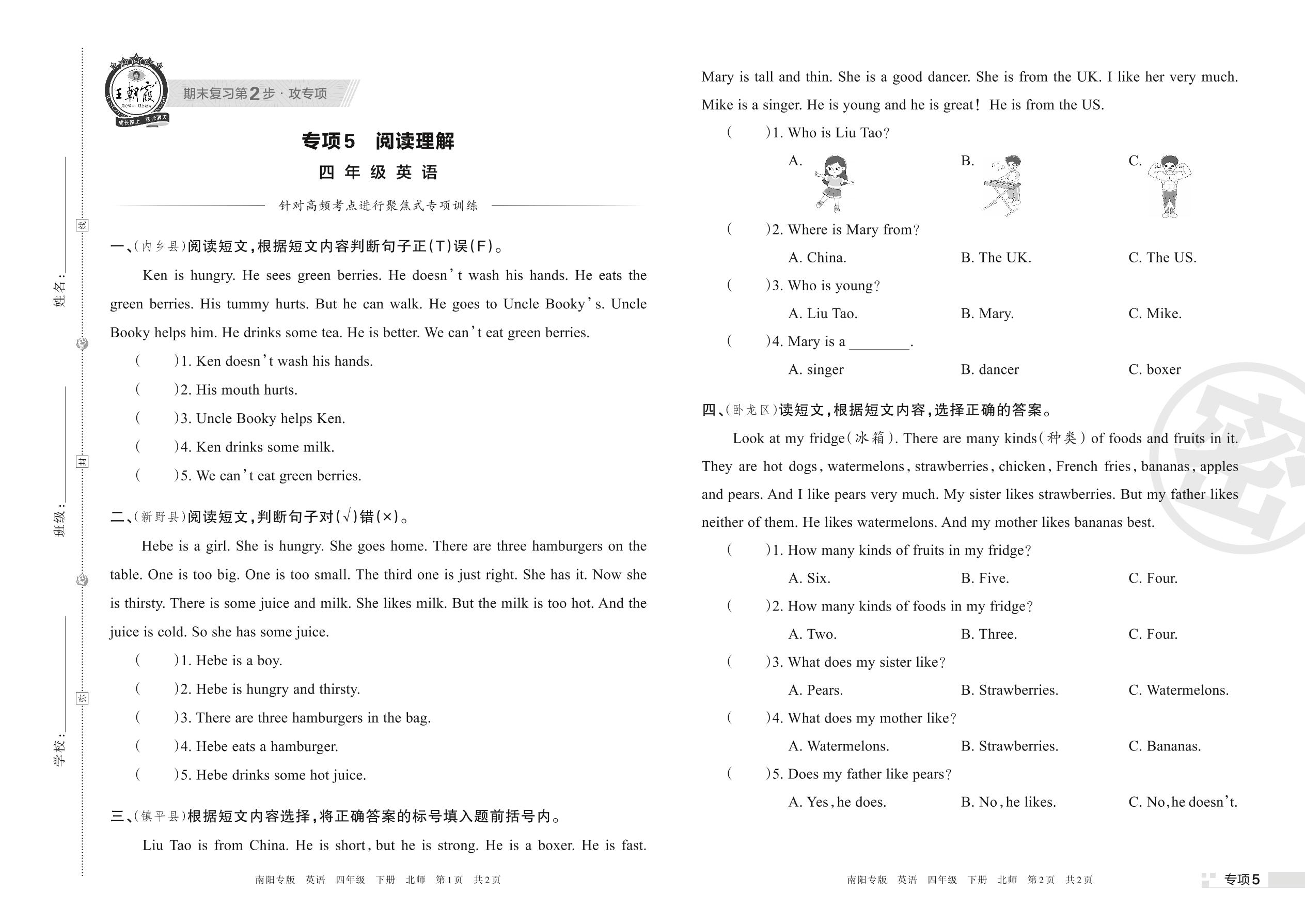 王朝霞期末专项卷——阅读理解四年级下册英语(北师版)【5】
