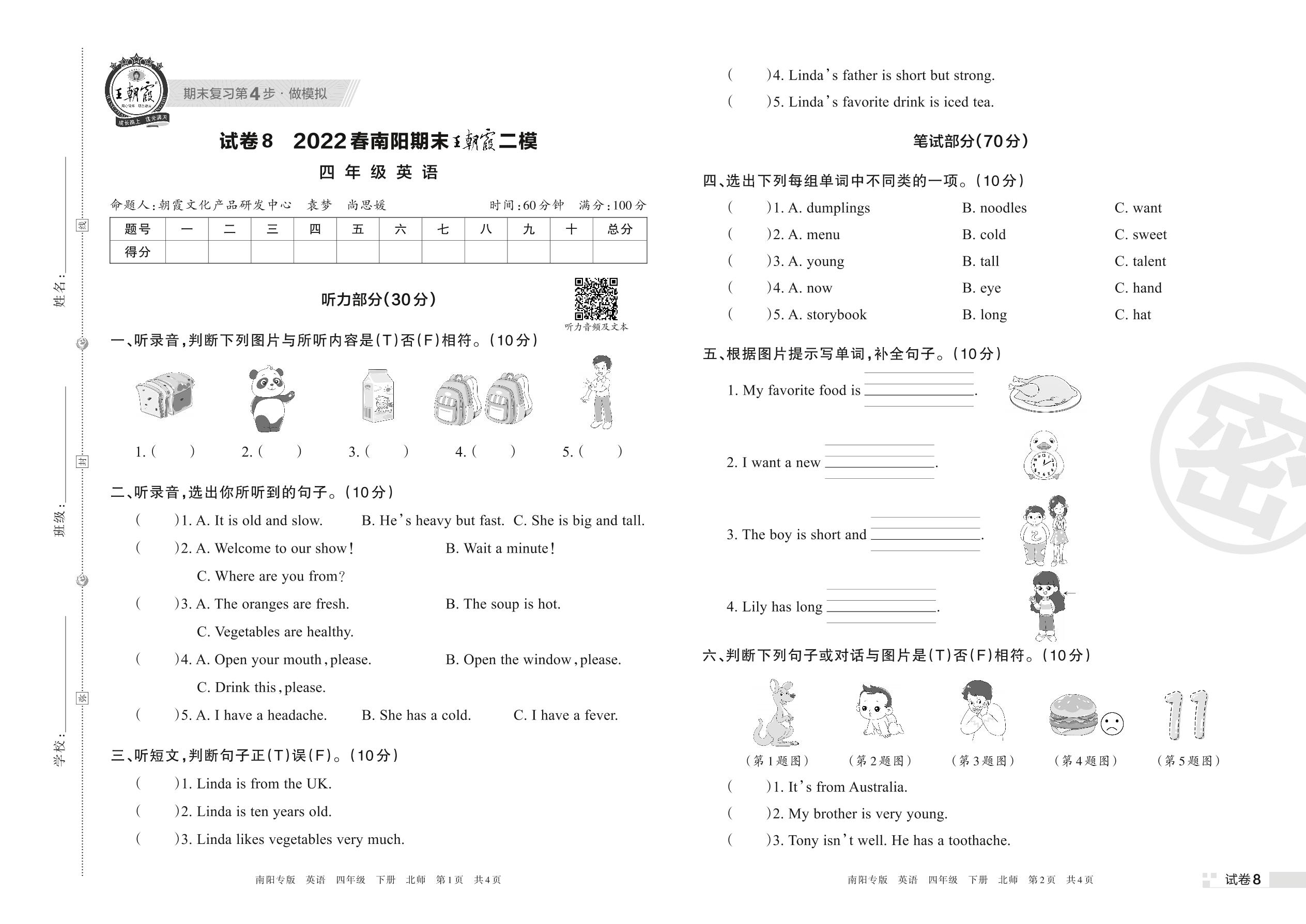 王朝霞期末模拟卷四年级下册英语(北师版)【8】