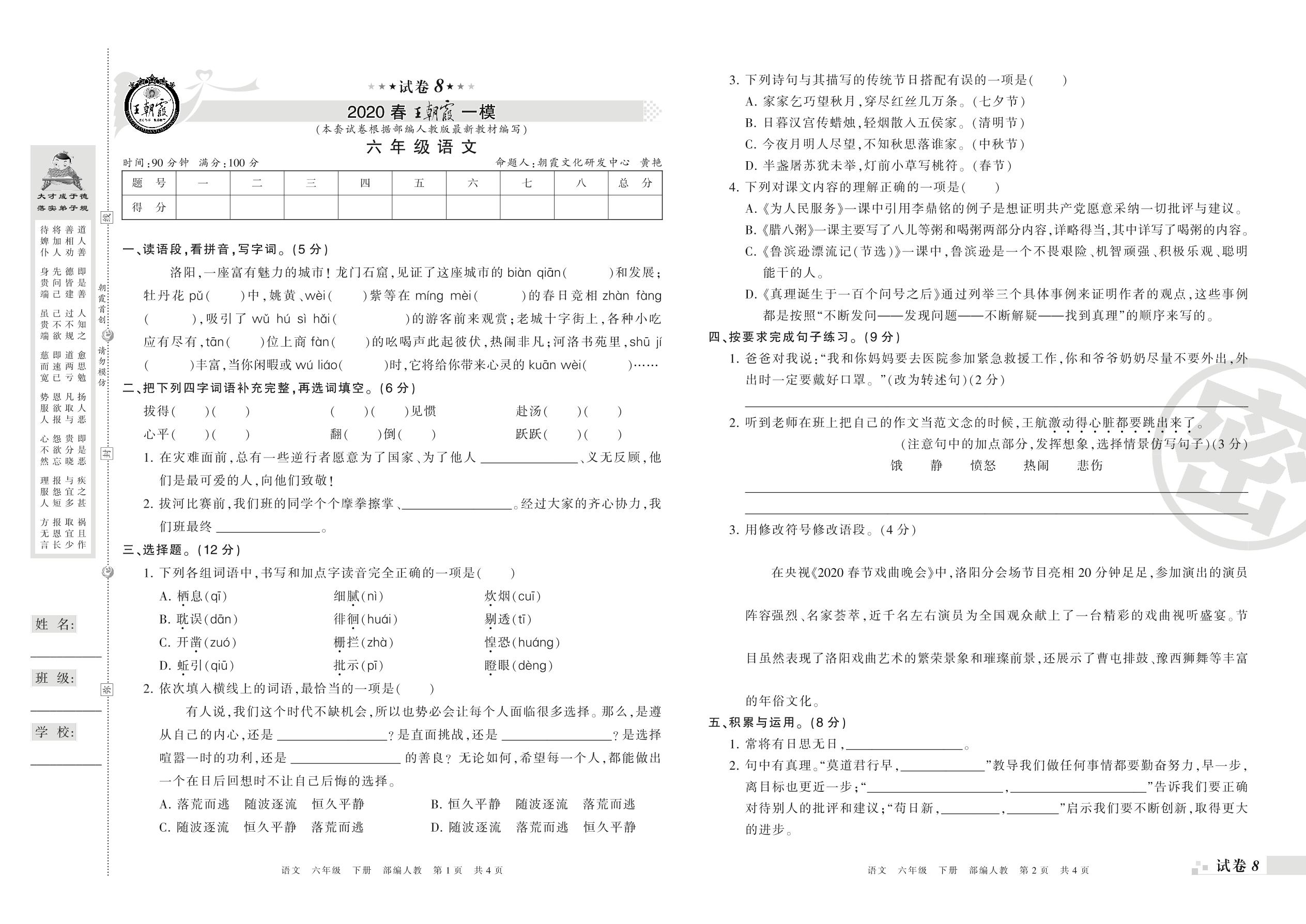 王朝霞期末模拟卷六年级下册语文(人教版)_R21080223502【8】
