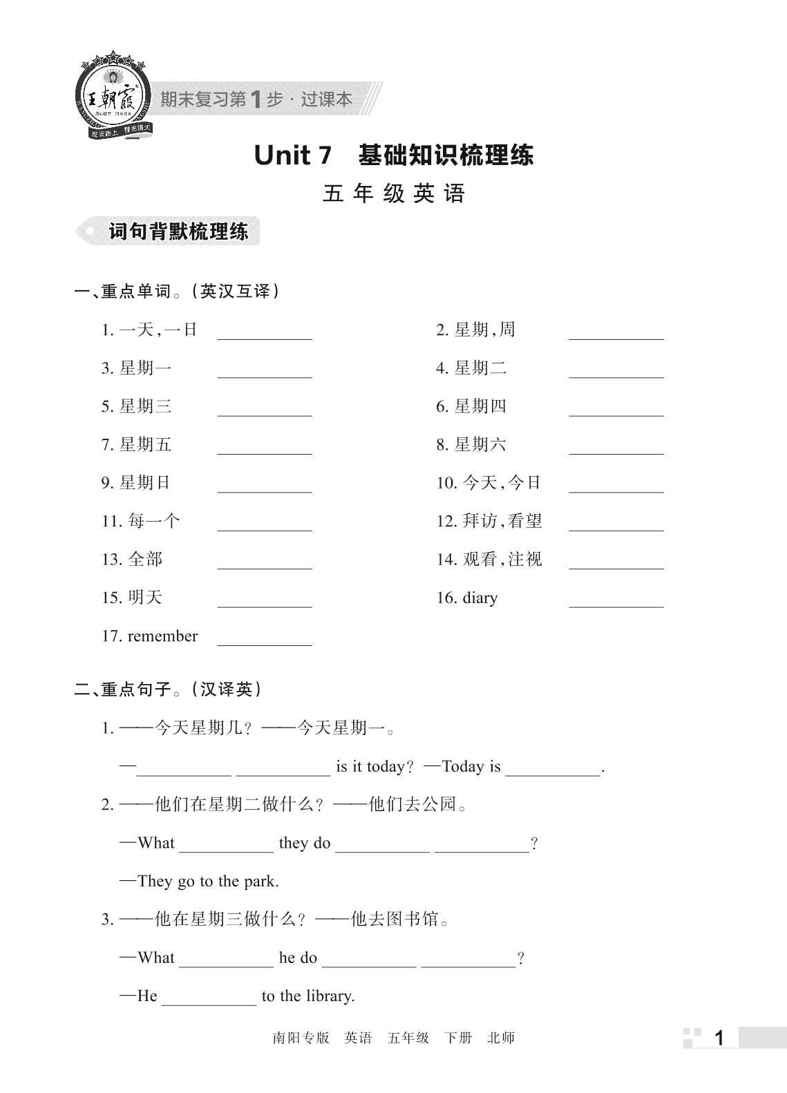 王朝霞期末过课本——Unit 7 基础知识梳理练五年级下册英语(北师版)